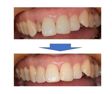 患者様のご希望としては、反対側の同名歯と同じ形、色に揃えたいとのことでした。(画像の黄色矢印が同名歯)